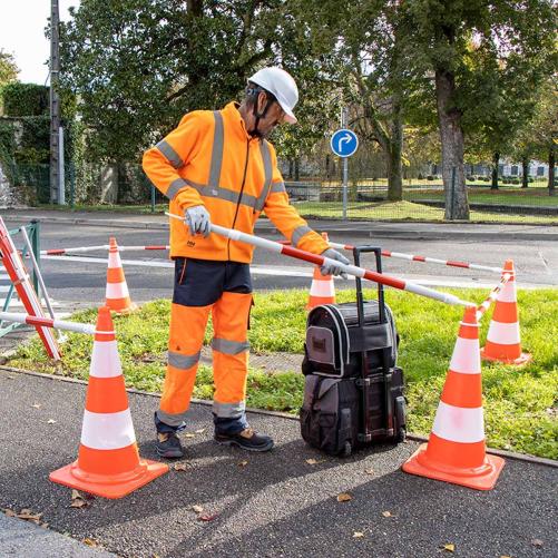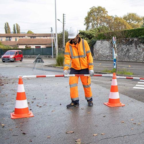 La barre télescopique empêche les passants de pénétrer dans des zones dangereuses. Associée à des balises de chantier également réfléchissantes (Classe 1 ou Classe 2), la barre permet d’installer très rapidement une zone de sécurité bien visible.