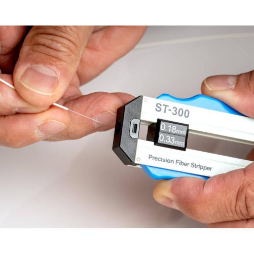 Le dénudeur de fibre optique ST-300 permet de dénuder facilement et proprement lle revêtement d'acrylate de 180 à 330 micros sur les fibres de verre après avoir retiré le revêtement tampon. Ses lames rectifiées et durcies offrent un résultat net. L'outil dispose d'une butée pour dénuder le câble sur une longueur déterminée par l'utilisateur, jusqu'à 5 cm.