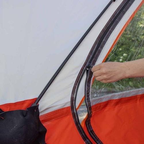 - Fermeture avec zip : les panneaux triangulaires de l’auvent se zippent et se dézippent facilement sur les fermetures éclairs de l’ouverture frontale