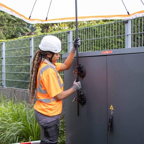 - Pratique : Une fois la toile installée, le parapluie-tente offre une surface de 170 x 170 cm afin de laisser au technicien la place pour effectuer diverses manipulations comme des protections d'épissures. La toile dispose également de six poches pour ranger divers outils.