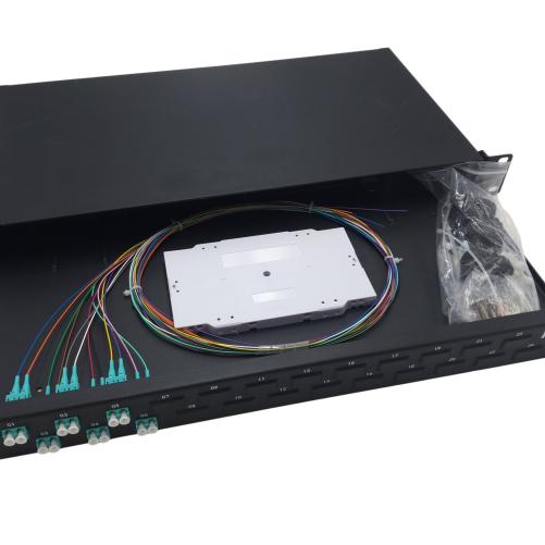 Tiroir 19" coulissant 1U 24 LCU DX G.657A2 équipé de 3 traversées LCU DX 6 pigtails