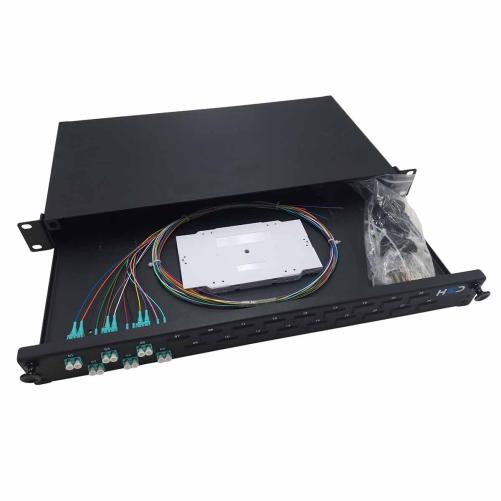 Tiroir 19" coulissant 1U 24 LCU DX OM3 équipé de 3 traversées LCU DX 6 pigtails