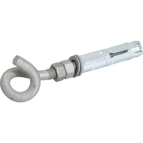 Arrêt d'un câble sur façade. Boulon M12 en acier galvanisé à chaud. Le boulon queue de cochon modèle BQC12 110E possède un Ø de 12mm et est livré avec une cheville à expansion.