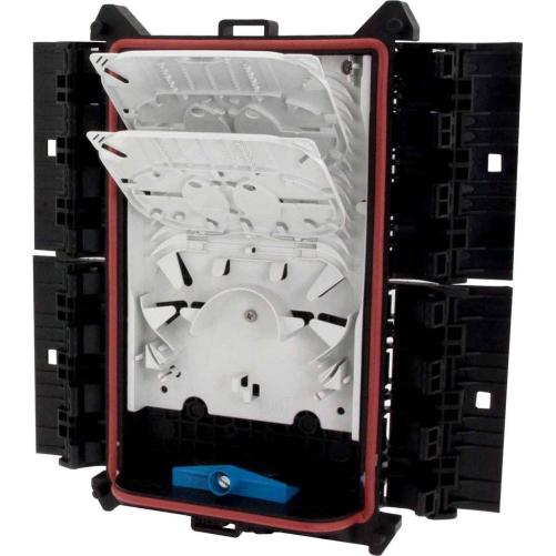 Le boîtier de protection d'épissures étanche Corning taille 1 permet le raccordement jusqu'à 72 épissures mécaniques type Fibrlok et 144 épissures fusion. L'organiseur accepte 12 cassettes avec de la micro-structure en passage et 8 lors du stockage de structure type loose tube.