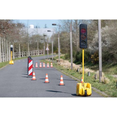 Jeu de 2 feux tricolores de chantier à LEDs haute visibilité pour alterner la circulation en cas de danger provisoire. Il est facilement réglable, et manipulable par une personne seule pour une installation simplifiée. Son déplacement se fait avec la roue à l'avant ou les roues arrières, à la façon d'une brouette ou d'un diable. Le décompteur et les cartes électroniques entièrement intégrés dans la tête du feu assurent un usage par tout temps. Une plaque polycarbonate protège les optiques des chocs et impacts.