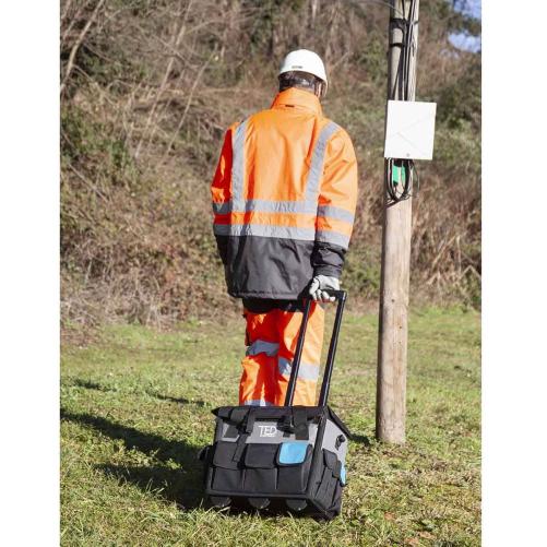 La valise à outil trolley TED® est l'accessoire de transport idéal pour les chantiers. Sa conception ingénieuse lui offre toutes les qualités pour un rangement efficace et personnalisé pour tout votre outillage. Elle dispose d'un rabat à l'avant. Une fois déployé, celui-ci laisse libre accès à 25 emplacements d'outils : pinces, clés, tournevis pourront être rangés de façon ordonnée. Le compartiment central est spacieux afin d'accueillir du matériel comme de l'électroportatif. Le trolley dispose également de 9 poches de rangement extérieures. Celles-ci permettent de stocker de nombreux éléments comme des sachets de chevilles, vis ou écrous ou encore des plug et cosses.