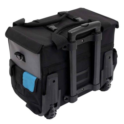 La valise est équipée d'une poignée télescopique et de roues tout terrain. Il est ainsi possible de la déplacer avec un minimum d'effort partout sur les chantiers. Elle conserve par ailleurs 2 anses pour faciliter le transport manuel lorsque celui-ci est nécessaire, dans des escaliers par exemple.