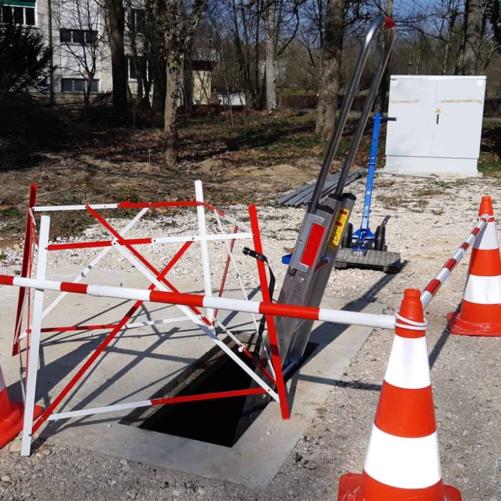 Ce dispositif est utilisé afin d'accéder facilement aux chambres souterraines, même les plus profondes. À l'aide de 2 plans de 8 barreaux chacun, il permet des accès allant jusqu'à 4 mètres. En aluminium et avec des échelons antidérapants remplaçables, il bénéficie d'une excellente durée de vie. Des compensateurs de niveaux isolés sont présents pour adapter le dispositif aux particularités des fonds des chambres souterraines. Une poignée de manutention offre une manipulation facile.