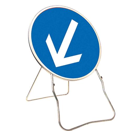 Panneau de signalisation temporaire signalant l'obligation de contourner un obstacle. Panneau rond avec tôle en acier galvanisé. Robuste et ergonomique, ce panneau monté sur pied lyonnais est facilement manipulable.